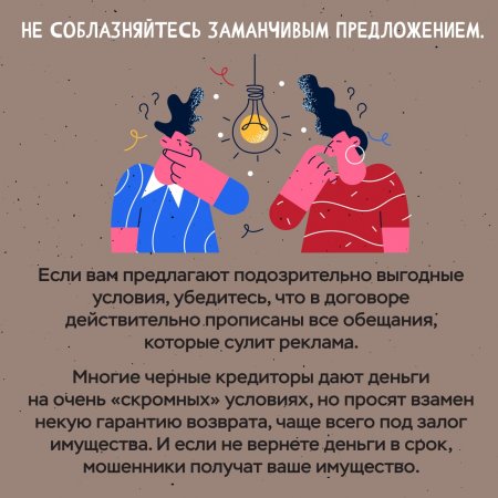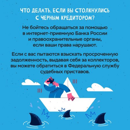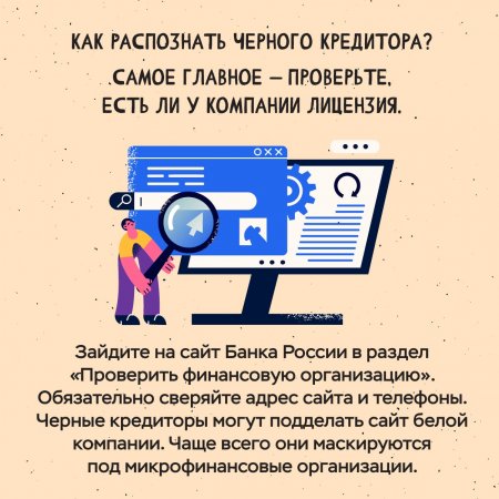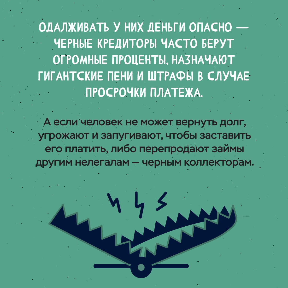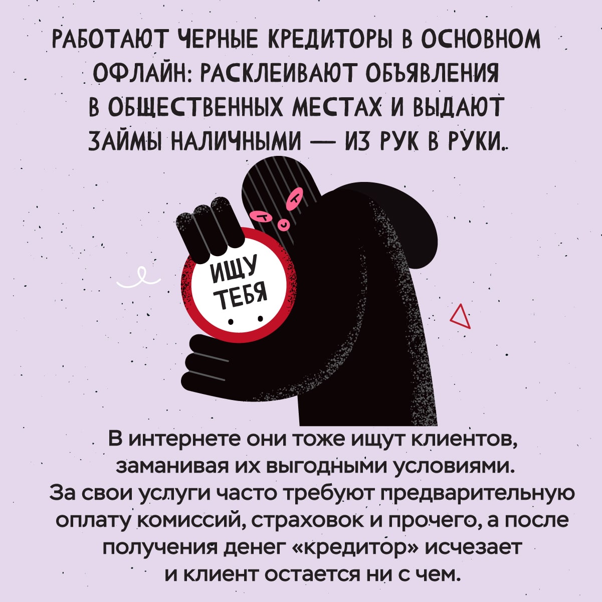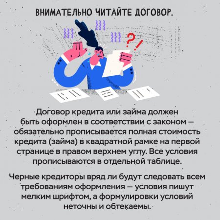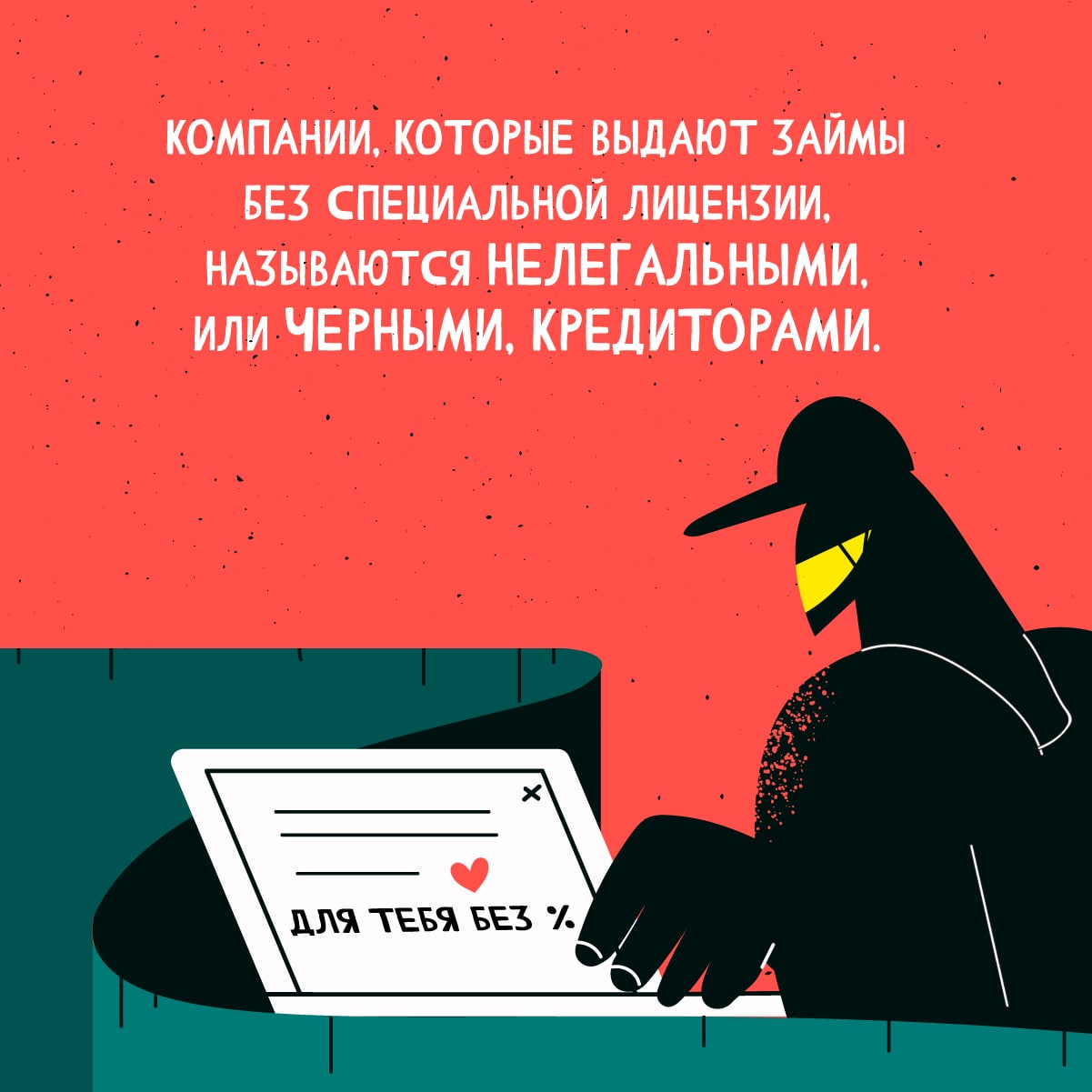 Нелегалы — это не только те, кто убеждает вас отдать им свои деньги, чтобы заработать бешеные проценты. Иногда они, наоборот, заманивают выгодными или быстрыми займами. В обоих случаях главное правило — проверяйте лицензию. Другие правила, которые помогут не стать жертвой черных кредиторов, — в карточках.