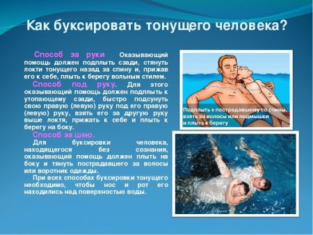 -Если хорошо плаваете, снимите одежду и обувь и вплавь доберитесь до тонущего. Заговорите с ним. Если услышите адекватный ответ, смело подставляйте ему плечо в качестве опоры и помогите доплыть до берега. Если же утопающий находится в панике, схватил вас и тащит за собой в воду, применяйте силу. Если освободиться от захвата вам не удается, сделайте глубокий вдох и нырните под воду, увлекая за собой спасаемого. Он обязательно отпустит вас. Если утопающий находится без сознания, можно транспортировать его до берега, держа за волосы.