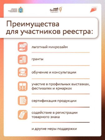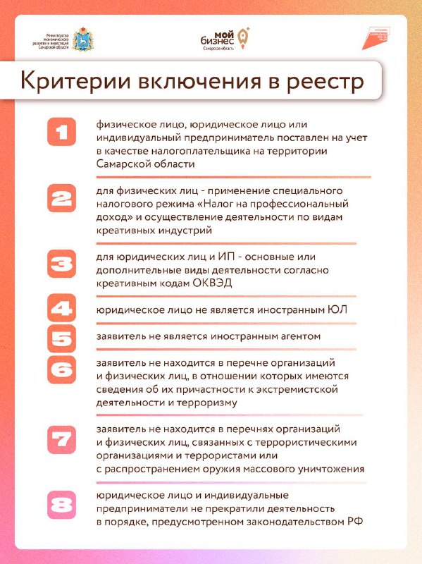 С подробной информацией: критериями включения в реестр, списком необходимых документов можно ознакомиться на едином портале господдержки mybiz63.ru в разделе «Реестр креативных индустрий Самарской области».