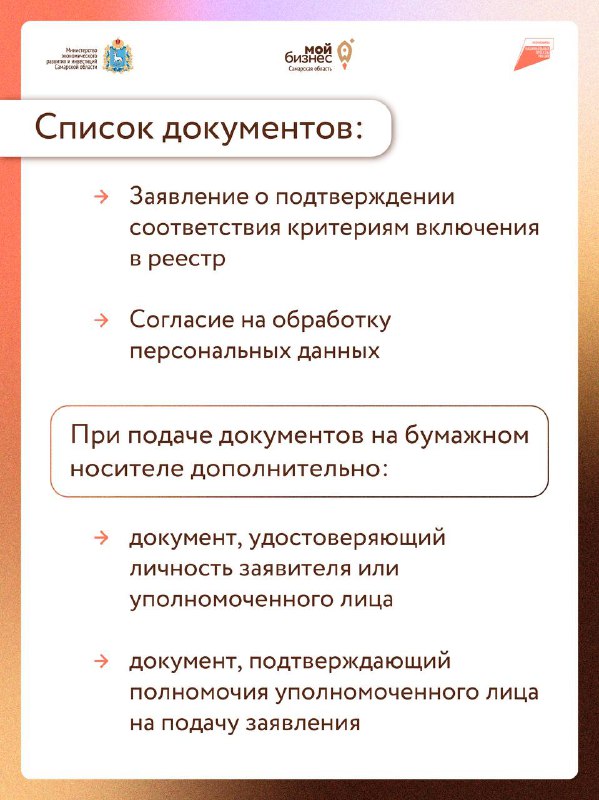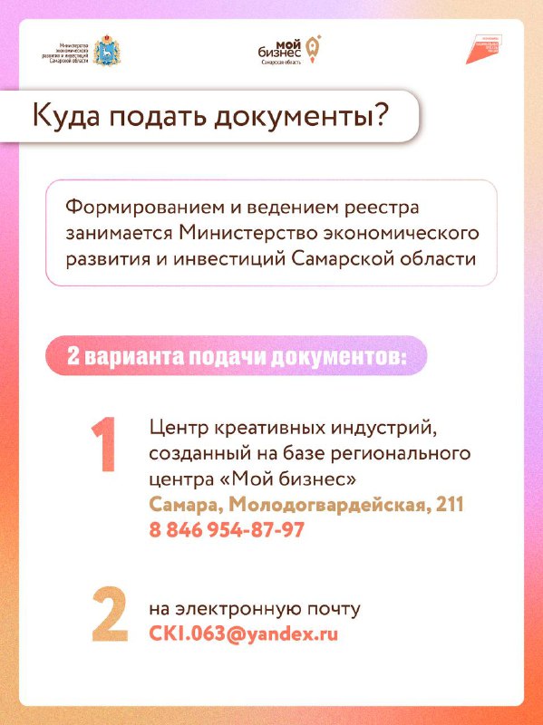 Для включения в перечень необходимо обратиться с заявлением и документами в Центр креативных индустрий, созданный на базе регионального центра «Мой бизнес» (г. Самара, ул. Молодогвардейская, 211). Также можно сделать это по электронной почте CKI.063@yandex.ru.