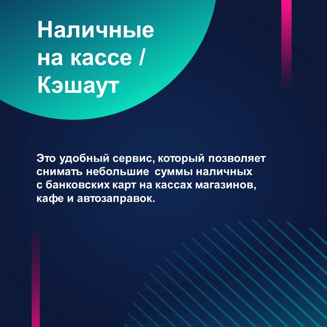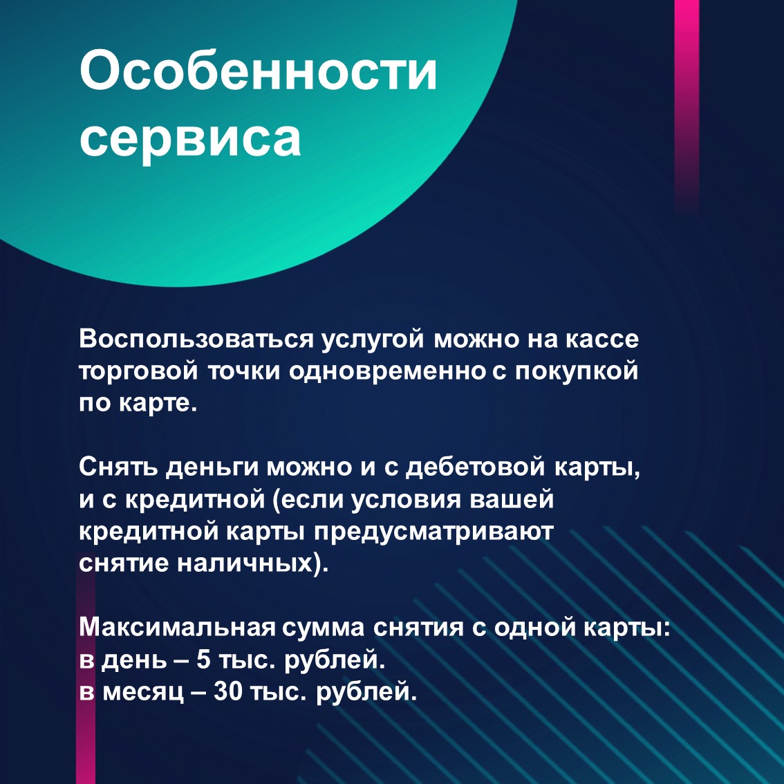Сервис позволяет держателям платежных карт снять наличные деньги с платежной карты на кассе магазина или заправки с использованием POS-терминала.