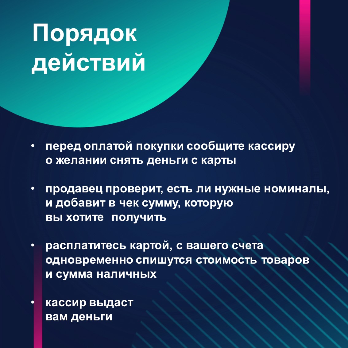 Перед оплатой покупки необходимо сообщить кассиру о намерении снять деньги с платежной карты, совершить покупку на любую сумму, получить покупку, наличные и чеки, подтверждающие покупку и снятие.