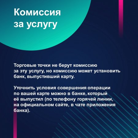 Торговые точки не берут с покупателей комиссию за выдачу наличных, но банк, выпустивший платежную карту может взимать комиссию за эту услугу. Перед операцией рекомендуется уточнить информацию в банке.