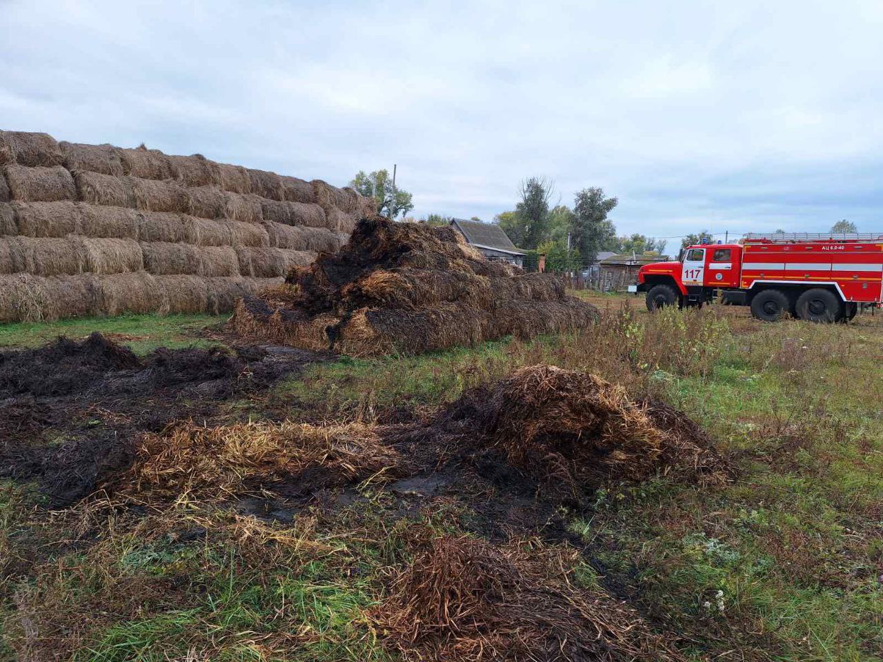 По прибытии на место вызова, огнеборцы установили, что горит сено в тюках массой 5 тонн. Угрозы распространения огня нет.