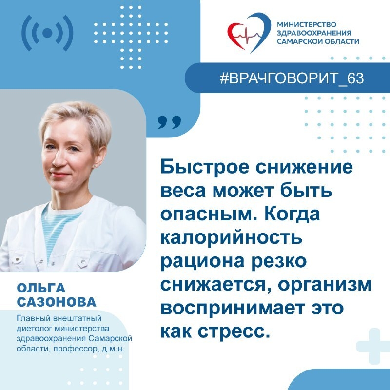 «Быстрое снижение веса может быть опасным. Когда калорийность рациона резко снижается, организм воспринимает это как стресс. Замедляется базовый обмен веществ, повышается уровень гормона кортизола, отвечающего за стрессовую реакцию, а также гормона, вызывающего чувство голода.Двигаться к снижению веса необходимо постепенно — примерно 0,5–1 кг в неделю. Такое плавное похудение обычно безопасно и комфортно для организма. При большом дефиците веса — например, 20–30 кг — в первую неделю можно похудеть на 2–2,5 кг.