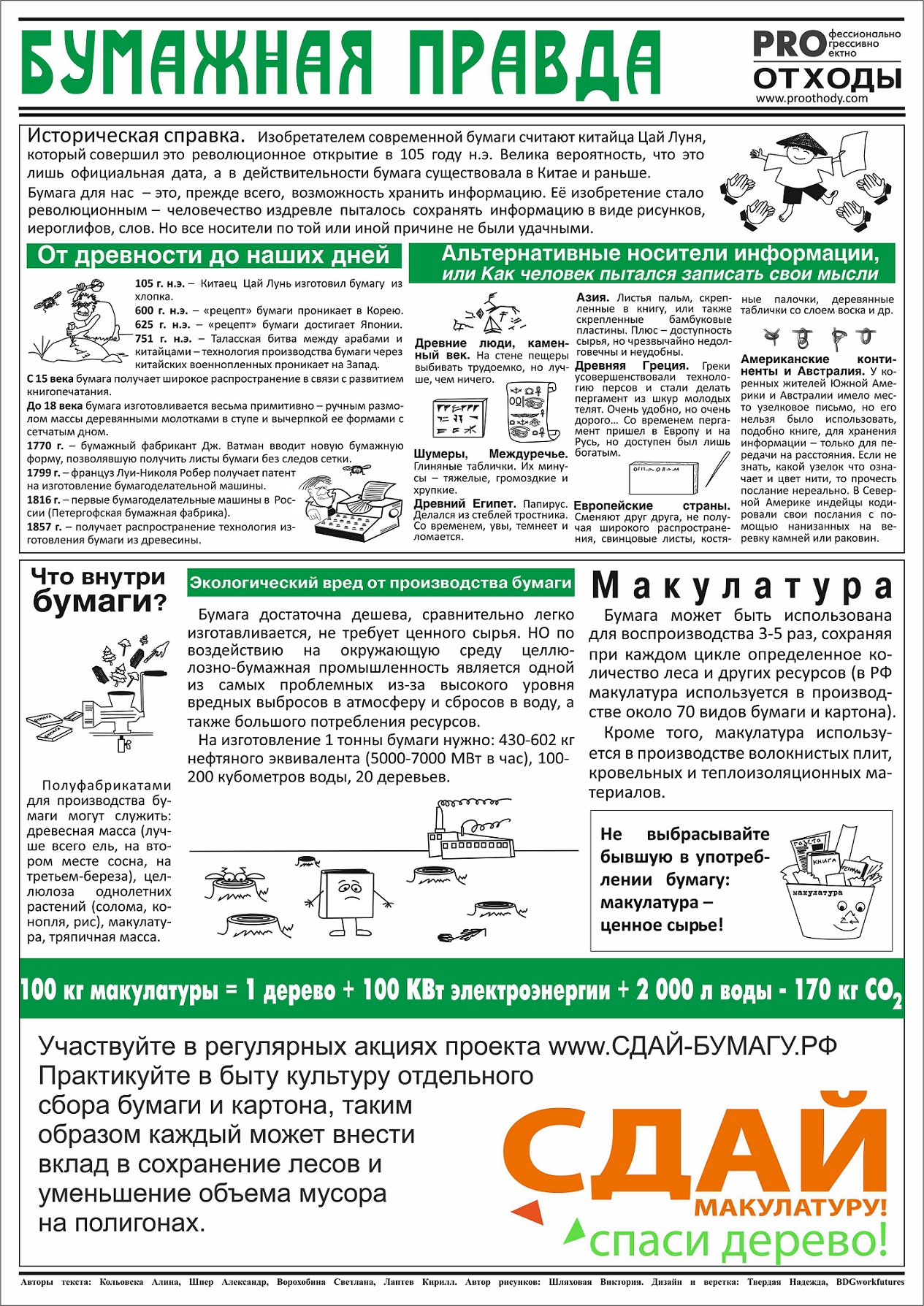 Вторичной переработке подлежат: глянцевые журналы, газеты, офисная бумага, тетради, крафт бумага, бумажная упаковка, книги, не представляющие литературной ценности и т.п.